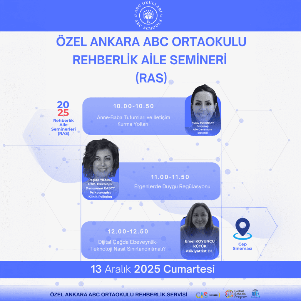 Özel Ankara ABC Ortaokulu Rehberlik Servisi tarafından yürütülen Rehberlik Aile Seminerleri (RAS) kapsamında, 2025 yılı Aralık ayında velilerimize yönelik kapsamlı aile eğitimleri düzenlenmiştir. Bu seminerler; öğrencilerin akademik, duygusal ve sosyal gelişimlerini desteklemede ailenin rolünü güçlendirmeyi, ebeveynlerin güncel psikolojik ve pedagojik konularda bilinçlenmesini amaçlamaktadır.